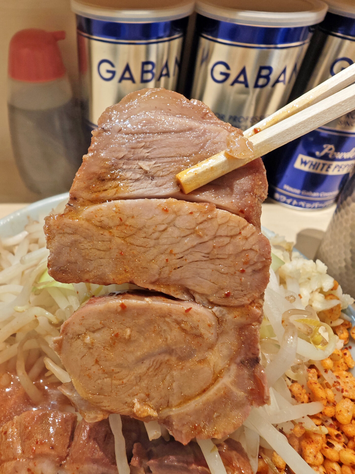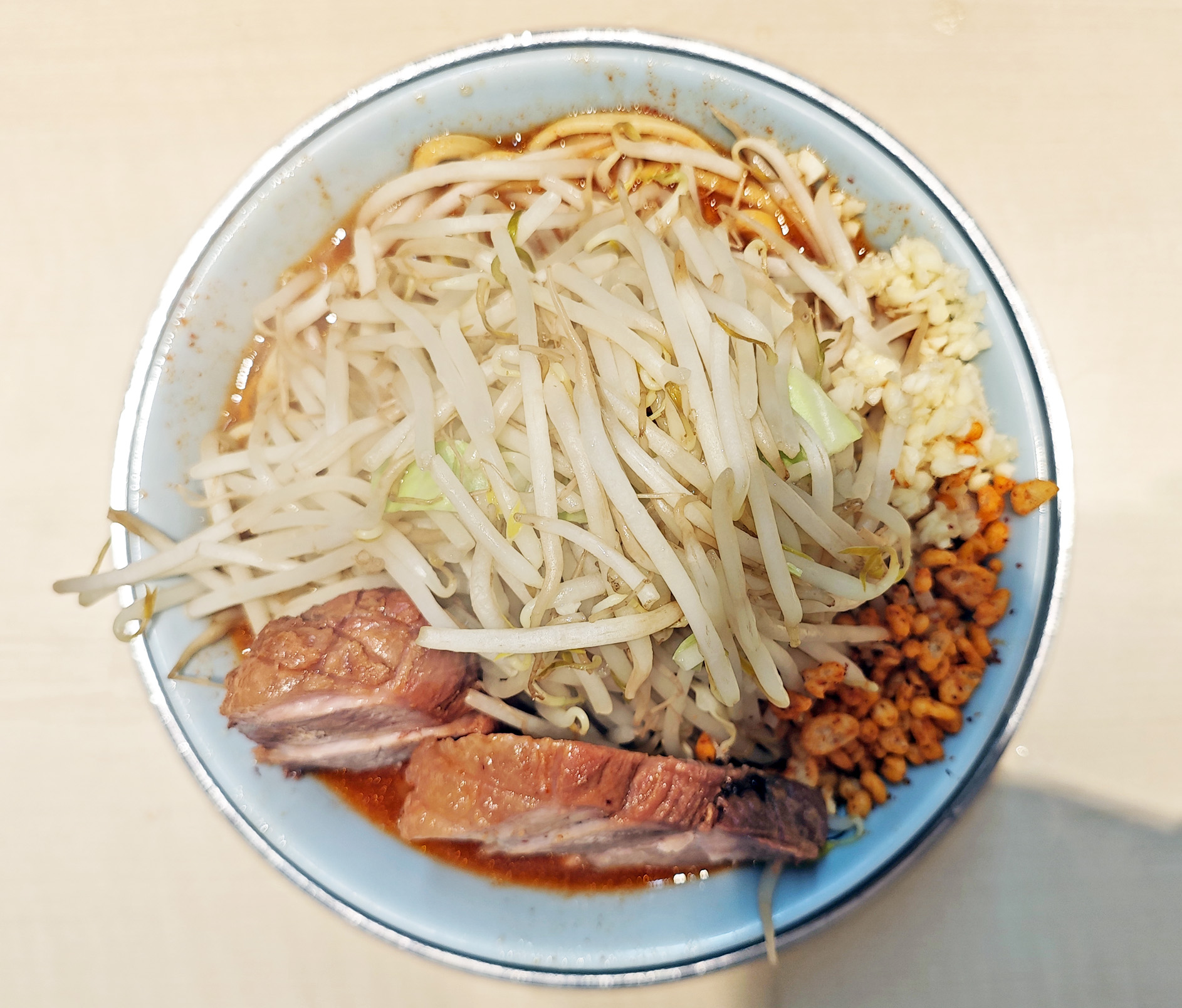 具は、豚(チャーシュー)2枚、もやし、キャベツ、無料トッピングのニンニク、辛あげ、です。