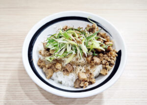 「チャーシュー丼」は、チャーシューの細切れ、そぼろ、ネギ、唐辛子が乗っています。