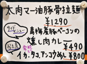 POPを見ると、「青梅産豚ベーコンの燻し肉カレー」が、とても美味しそうで気になります。
