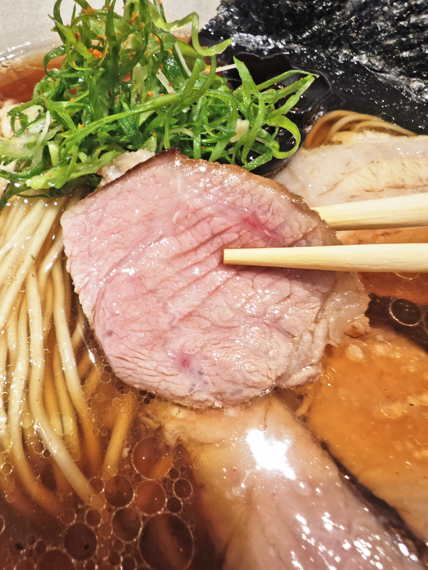 ラーメンの具は、チャーシューが3種、キクラゲ、ネギ、そして、トッピングで追加した”おいしい海苔”です。