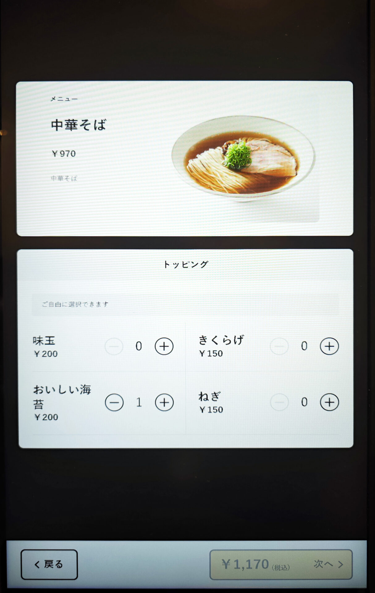 トッピングは、「味玉」「きくらげ」「おいしい海苔」「ねぎ」の4種類。
