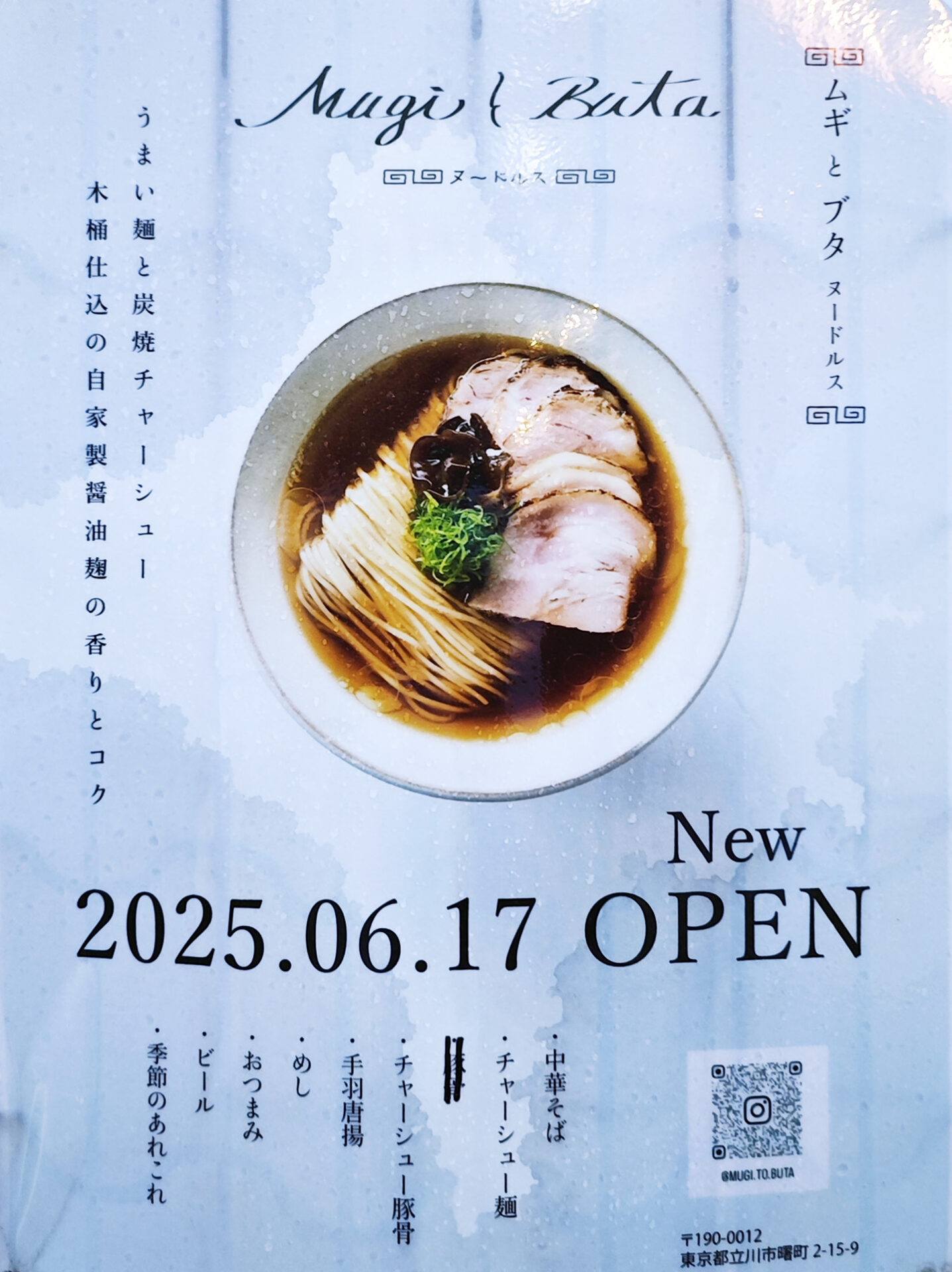 2025年の6月17日に、立川の駅(北側)近くに、「MugiとButaヌードルス」という新しいお店が出来ました。