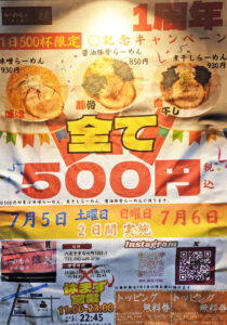 1周年を記念して7月5日(土)と7月6日(日)の二日間、「味噌」「豚骨」「煮干し」ラーメンが、すべて500円で食べれます!