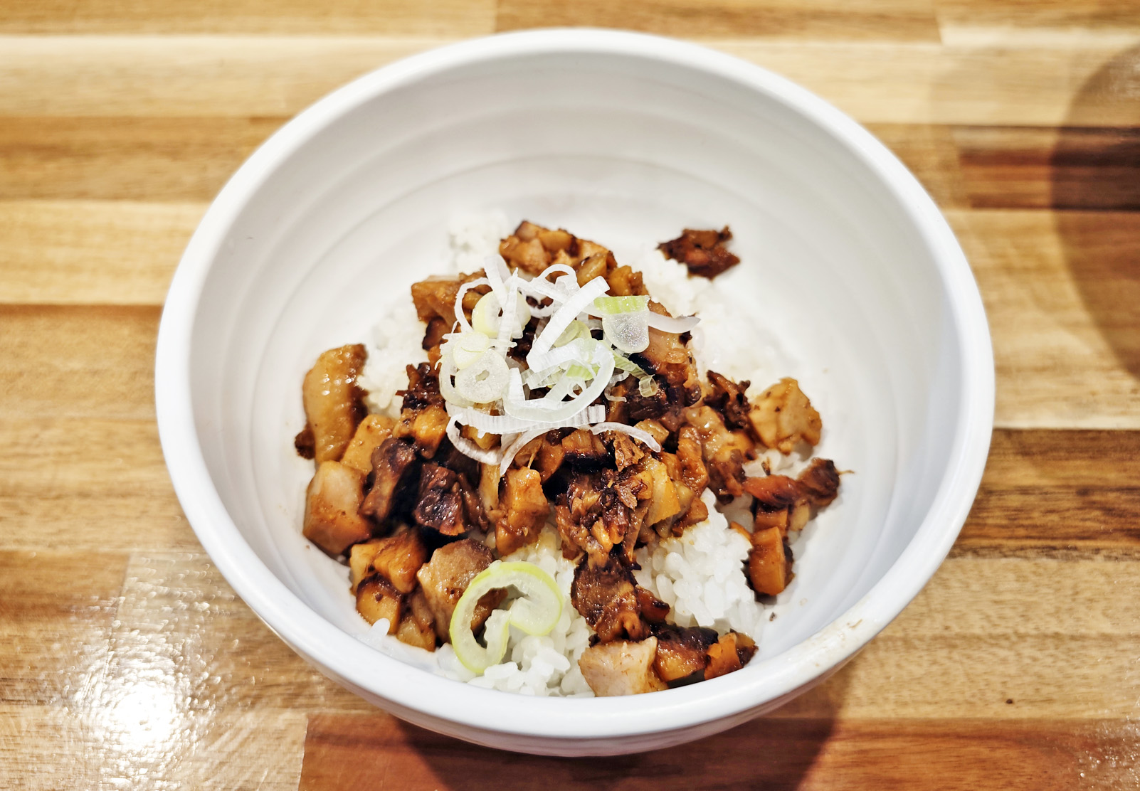 「肉丼」は、ご飯の上に細切れのお肉と、ネギが乗っています。