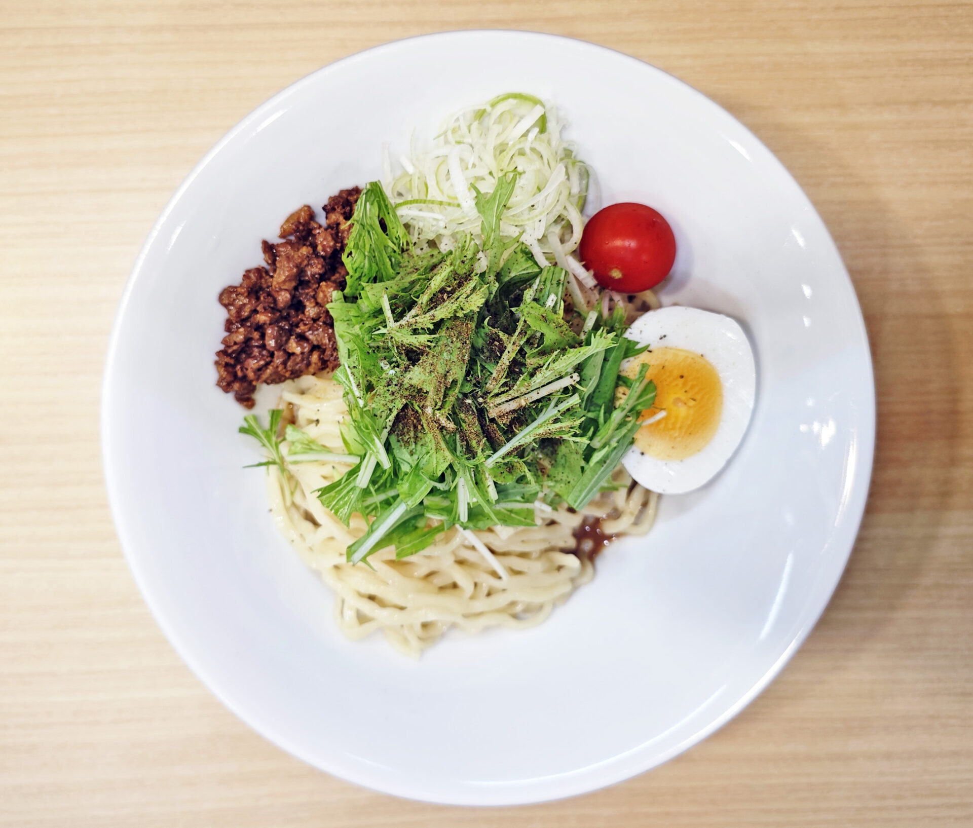 具は、ひき肉、ゆで卵(半分)、ネギ、水菜、プチトマトが乗ってきます。