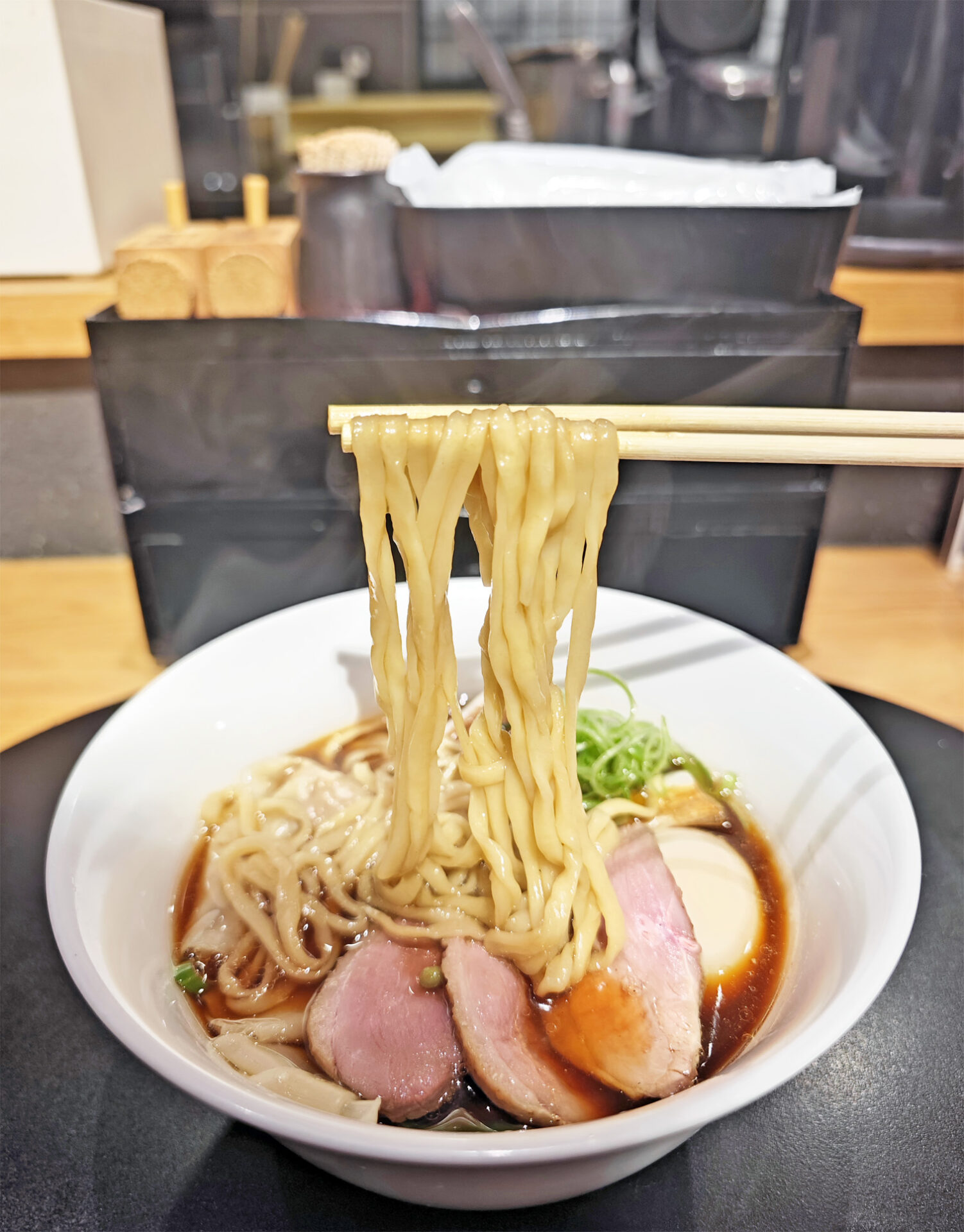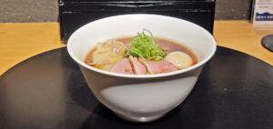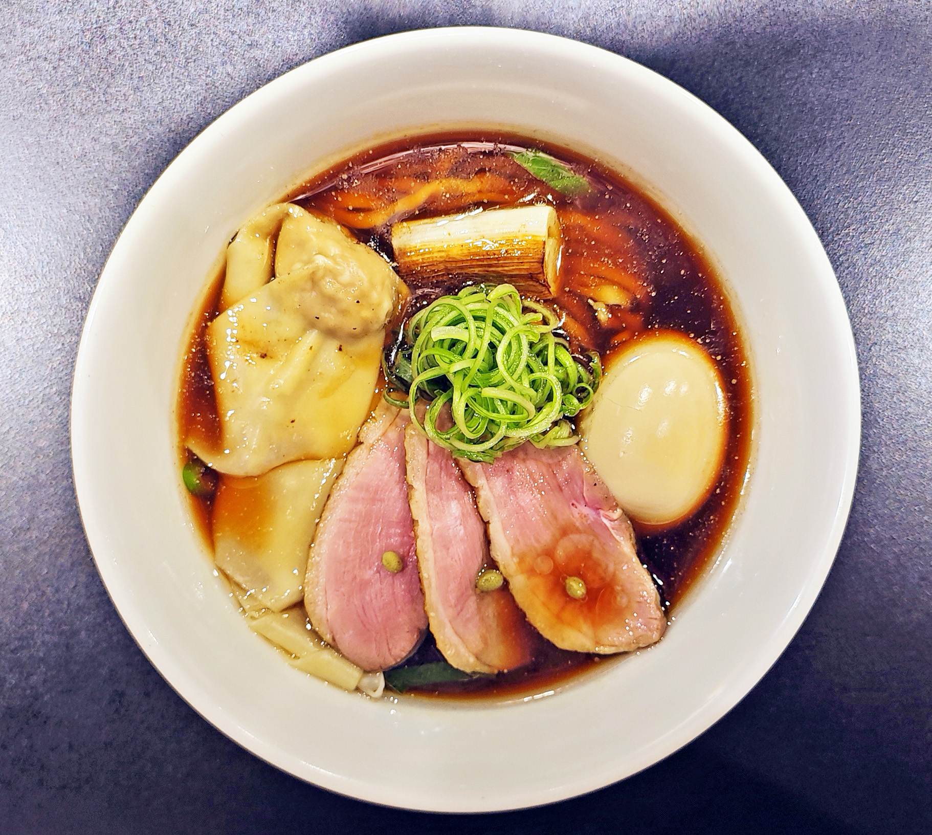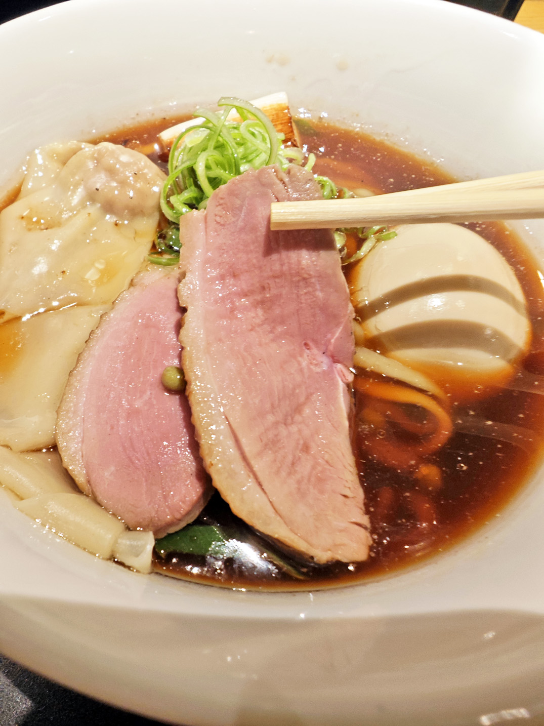 ”特製”になると、鴨ロース3枚、焼葱2本、九条ネギ、鴨ワンタン2ヶ、奥久慈あじ玉、などがトッピングされます。