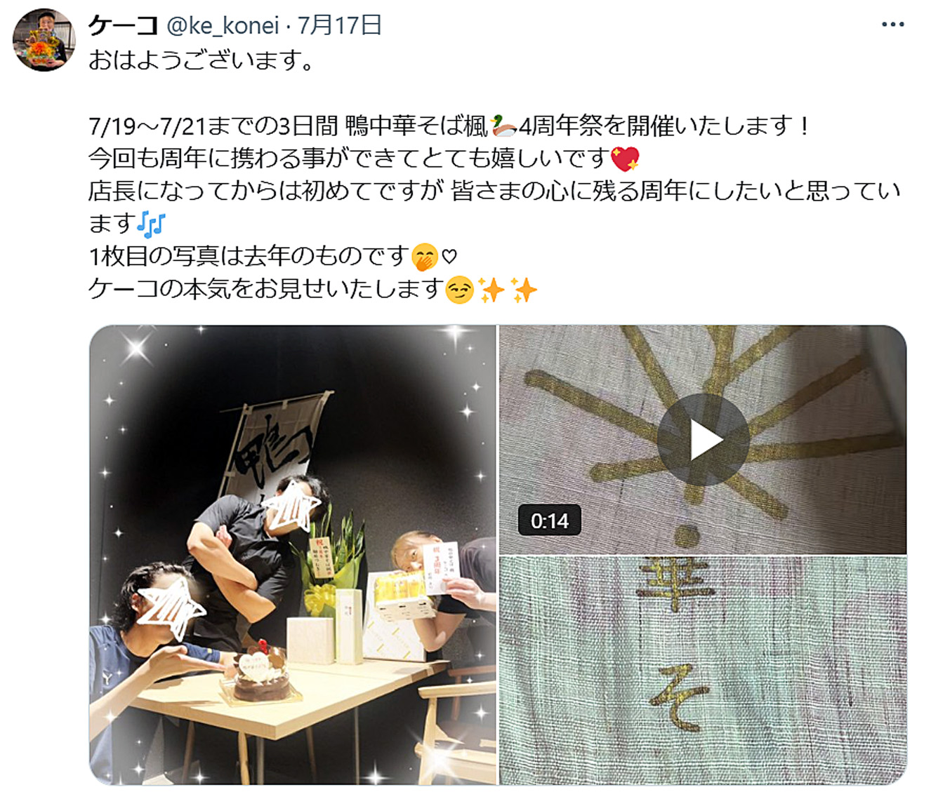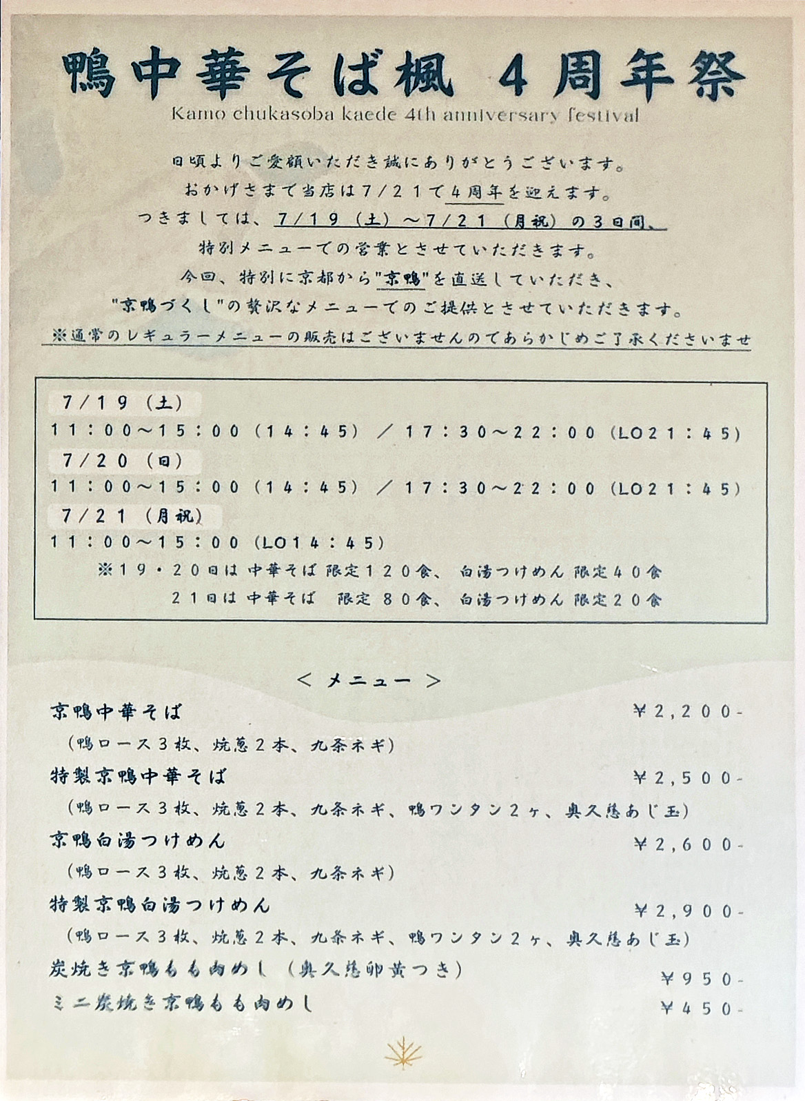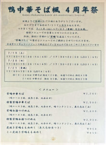 7月19日(土)から21日(月)までの3日間、「鴨中華そば楓」の4周年祭が開催されます。