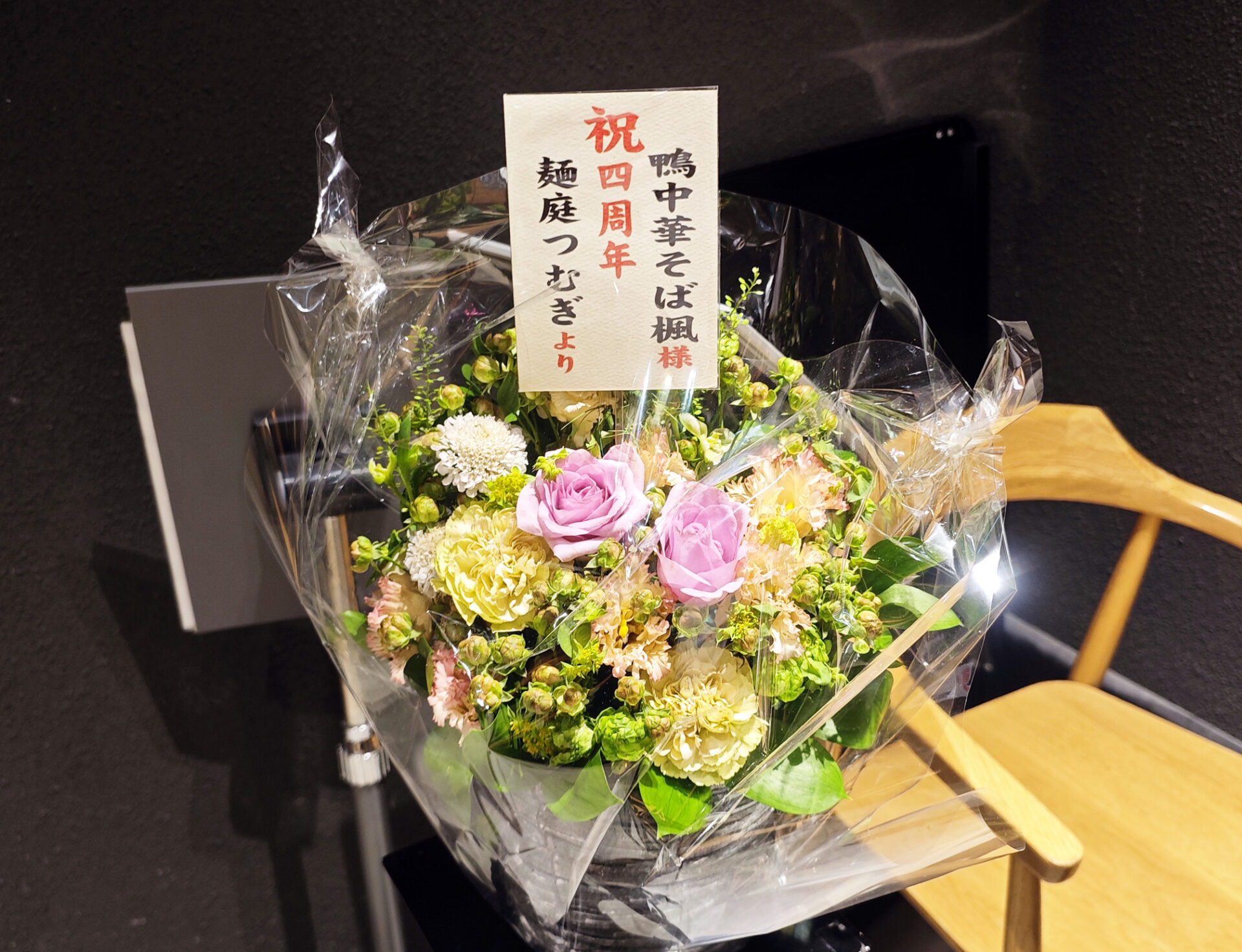 お店に入ると「麺庭つむぎ」から、お祝いのお花が届いていました。