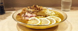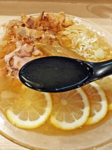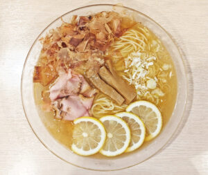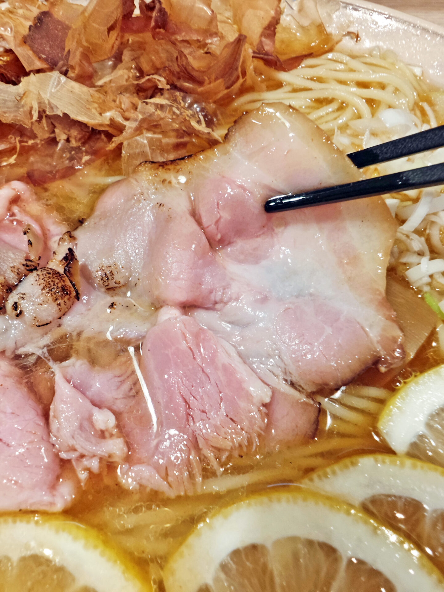 具は、チャーシュー、メンマ、レモンスライス、ネギ、花かつお、です。