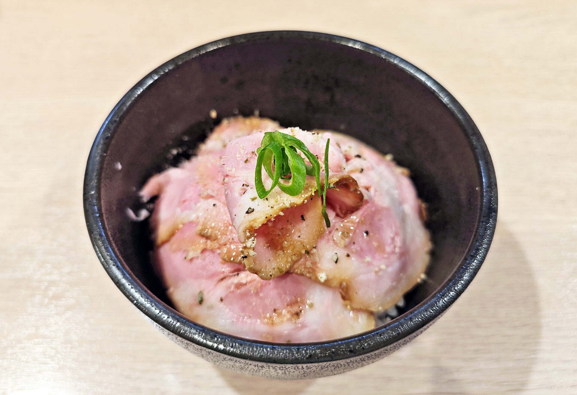 「焼豚丼」は、ご飯を覆うように、低温チャーシューが敷き詰められています。