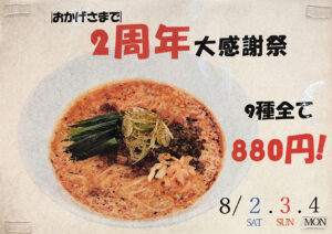 8月2日(土)・3日(日)・4日(月)の三日間、「担担麺 微風」で、2周年大感謝祭が開催されます。