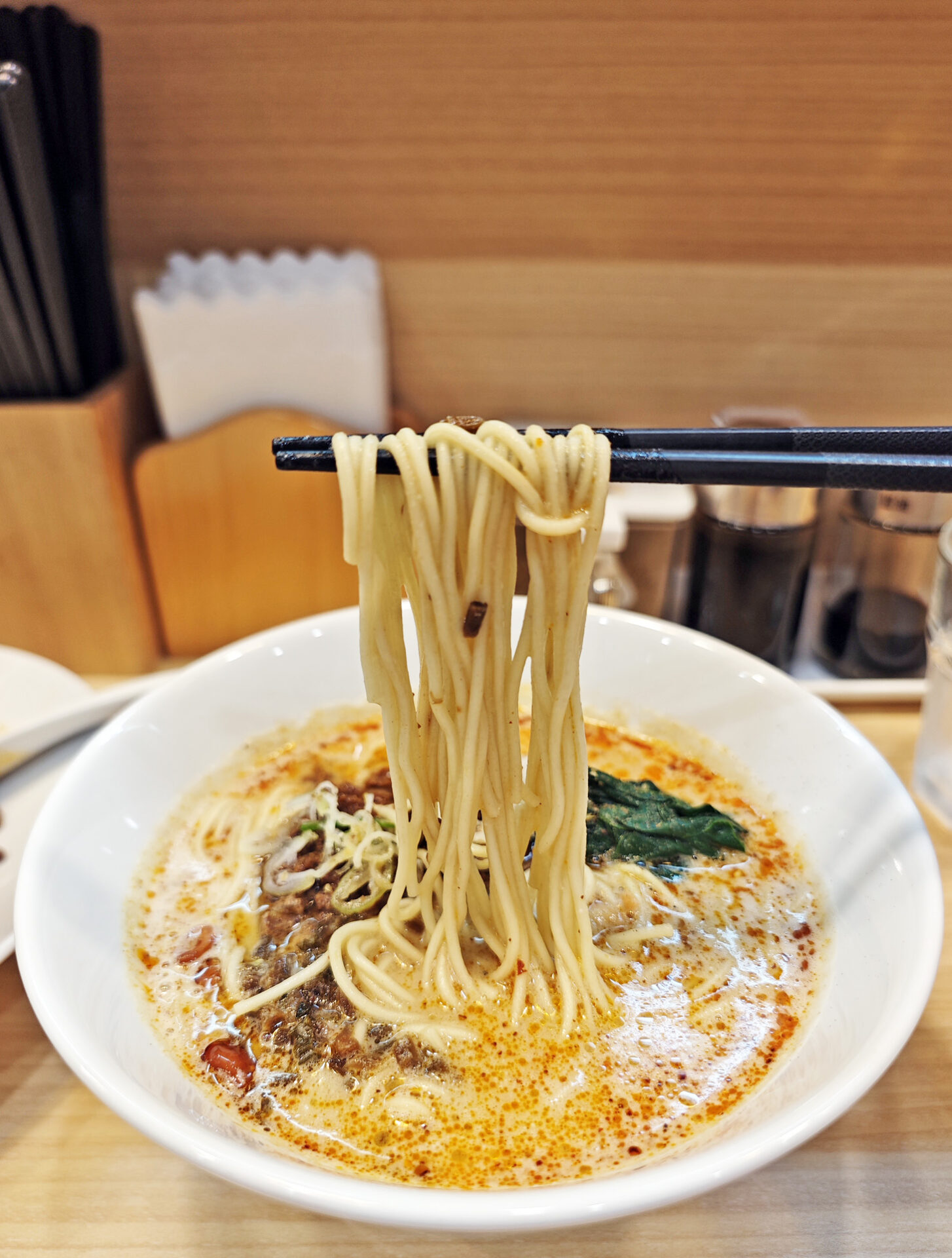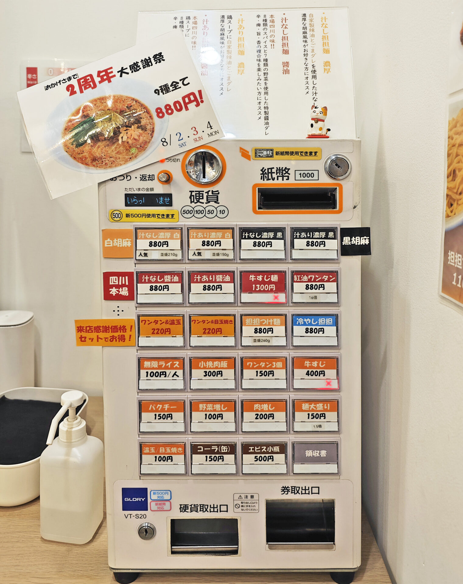 880円になるのは、白胡麻(汁あり・汁なし)、黒胡麻(汁あり・汁なし)、醤油(汁あり・汁なし)、紅油ワンタン、担担つけ麺、冷やし担担、の9種類です。