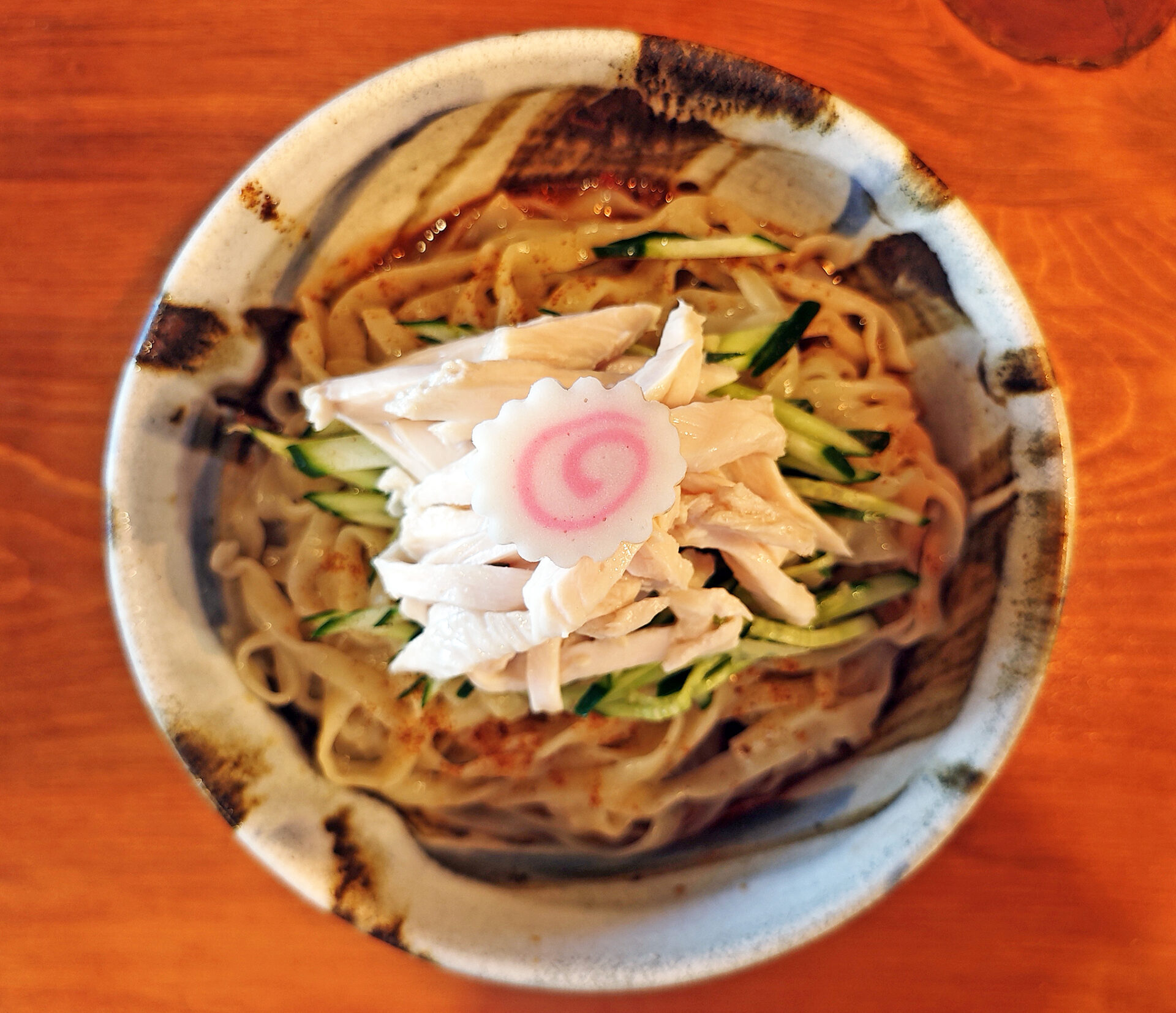 「カラシビ冷し担々麺」は、具として、鶏肉、キュウリ、ナルトなどが乗っています。