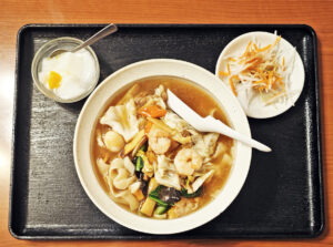 ラーメンは、豚肉、海老、イカ、ウズラ、メンマ、キャベツ、ニンジン、小松菜、キクラゲ、など具だくさん!