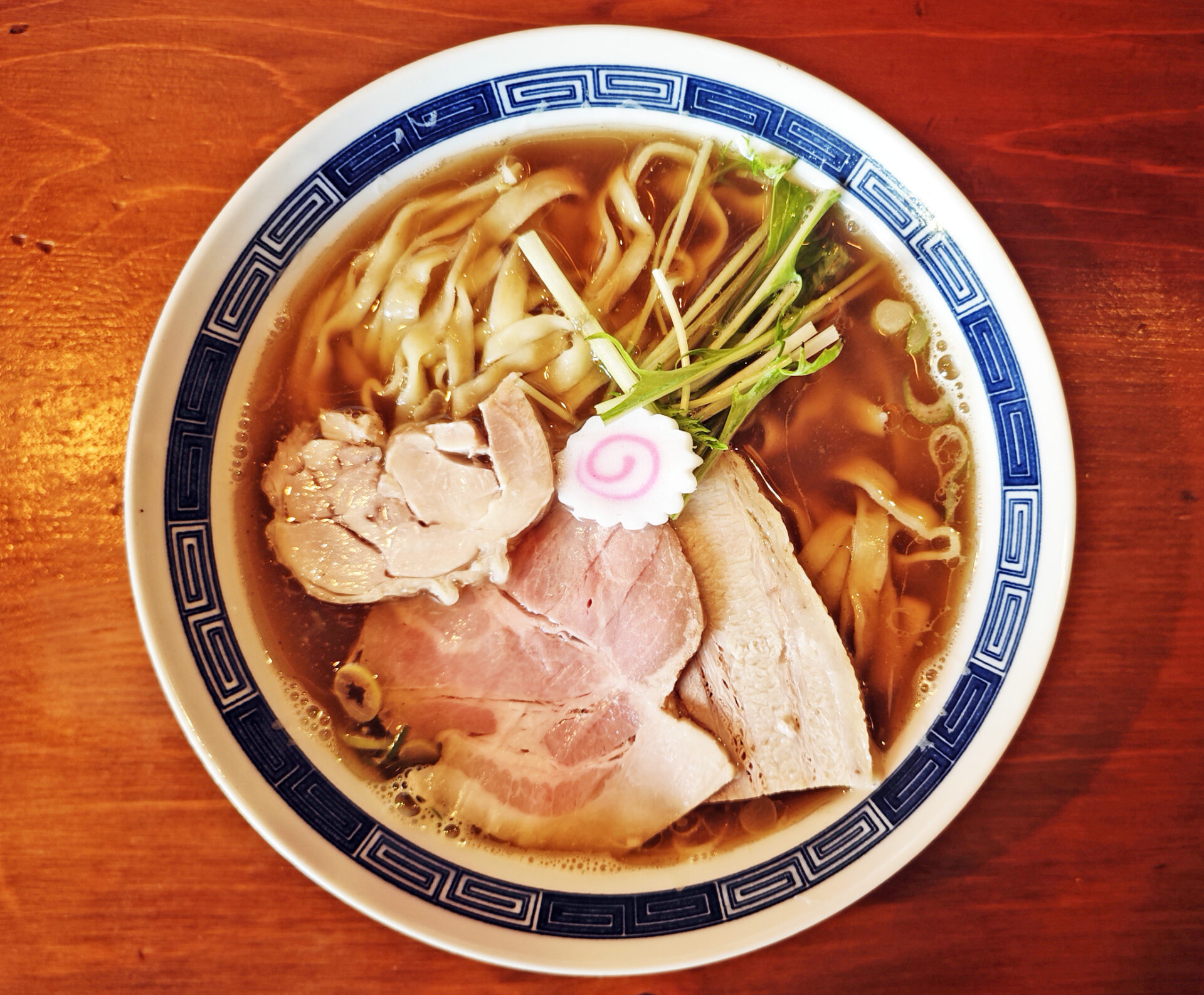 出てきた「中華そば」は、チャーシューが3種、ナルト、水菜、がトッピングされています。