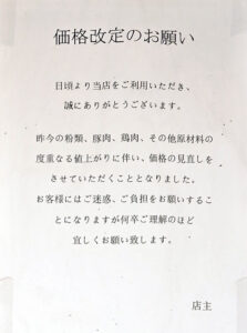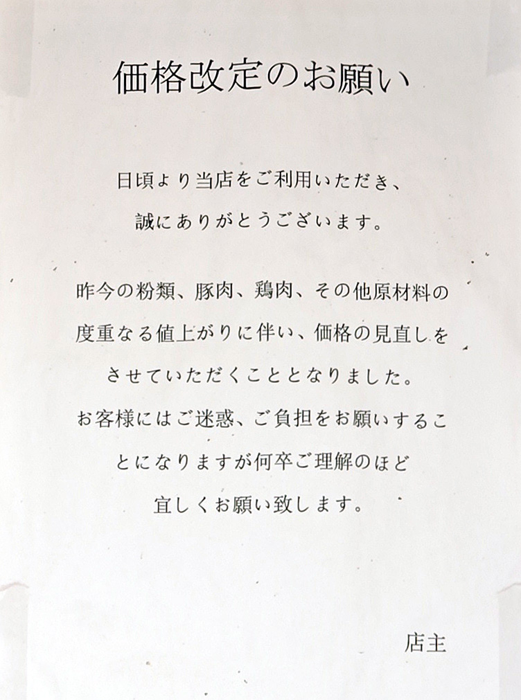 ラーメンの価格がたびたび値上げされていますが、また値上げの告知が出ていました。