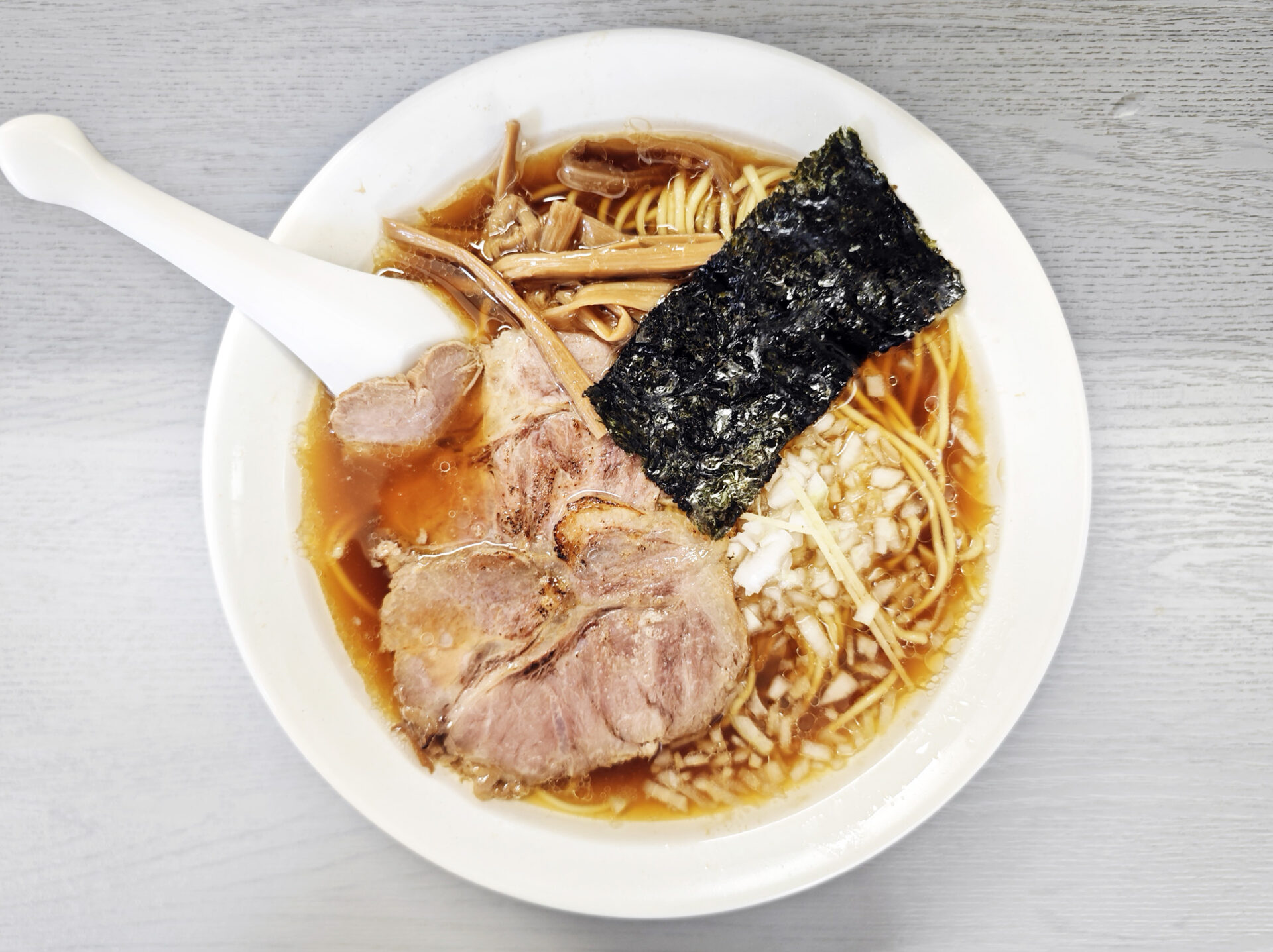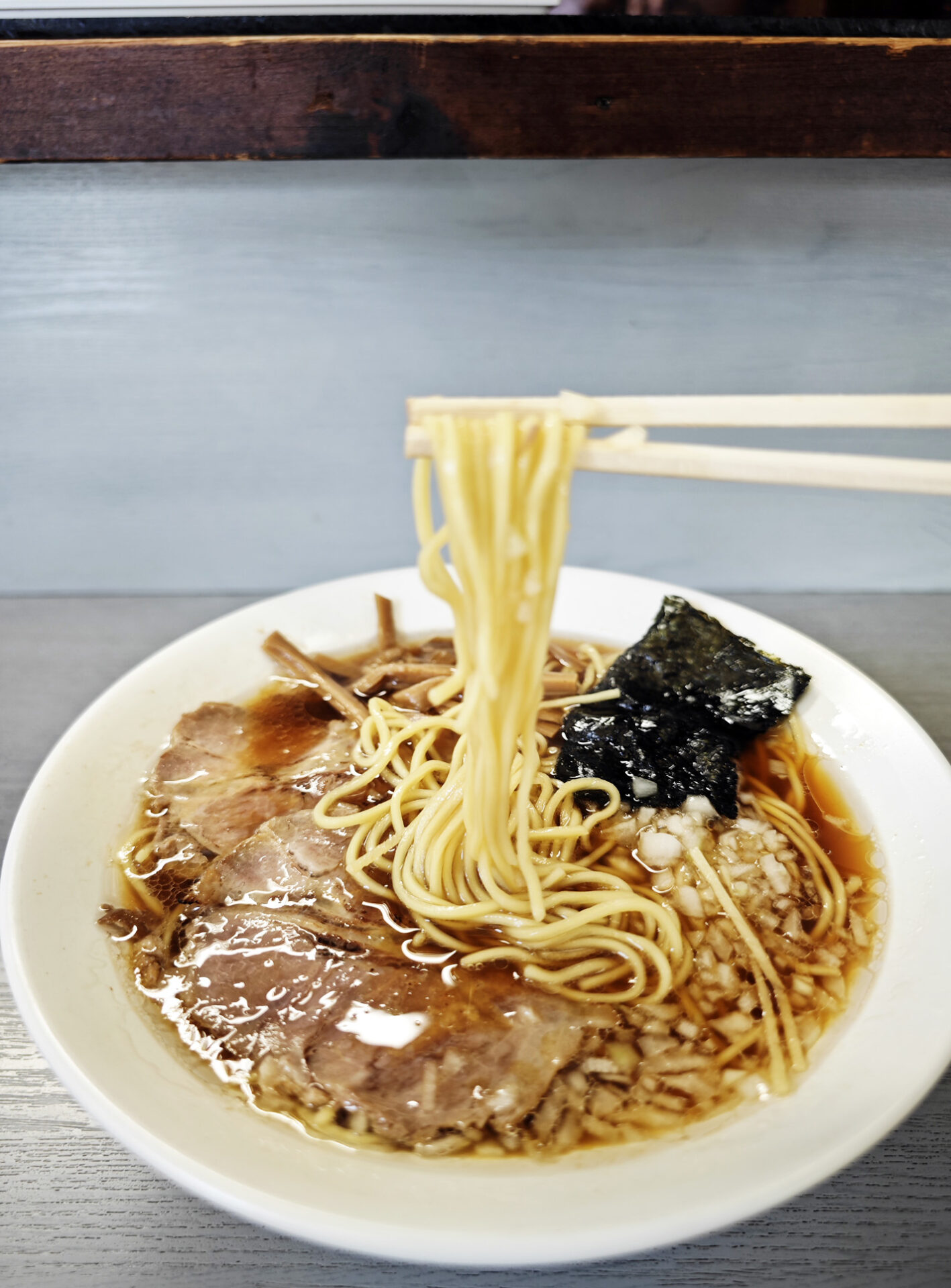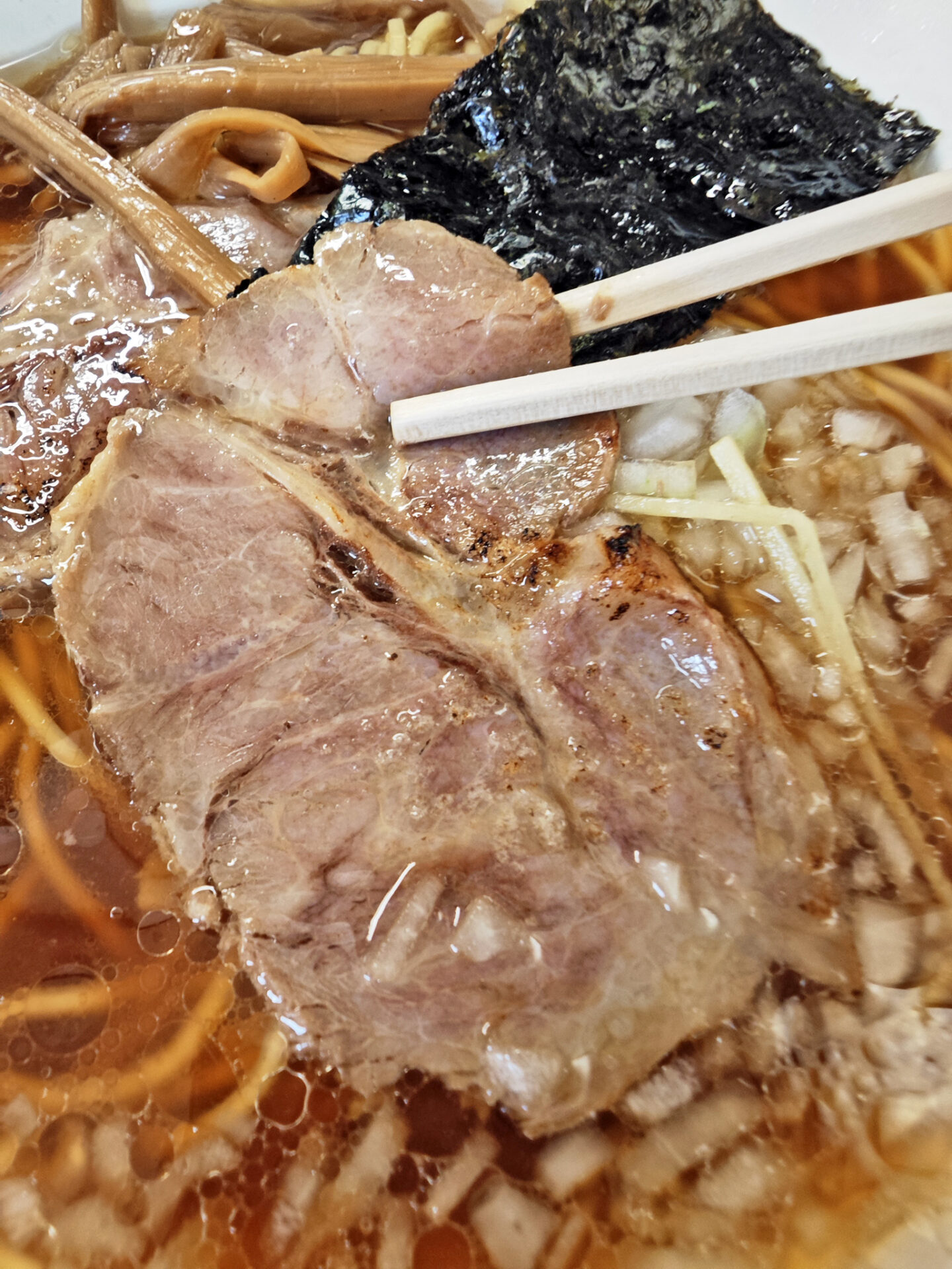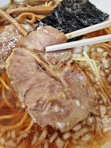 ラーメンには、チャーシュー、メンマ、海苔、刻み玉ネギ、針生姜、が乗っています。