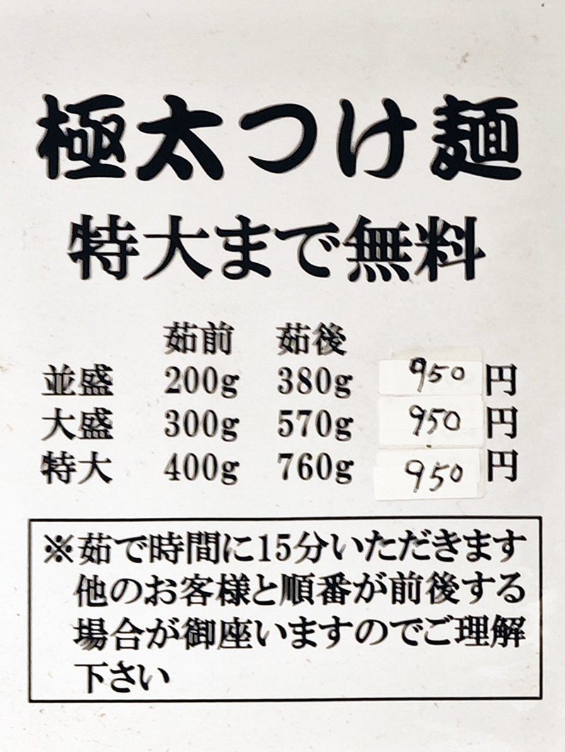 「極太つけ麺」は、特大まで麺量が無料だそうです!