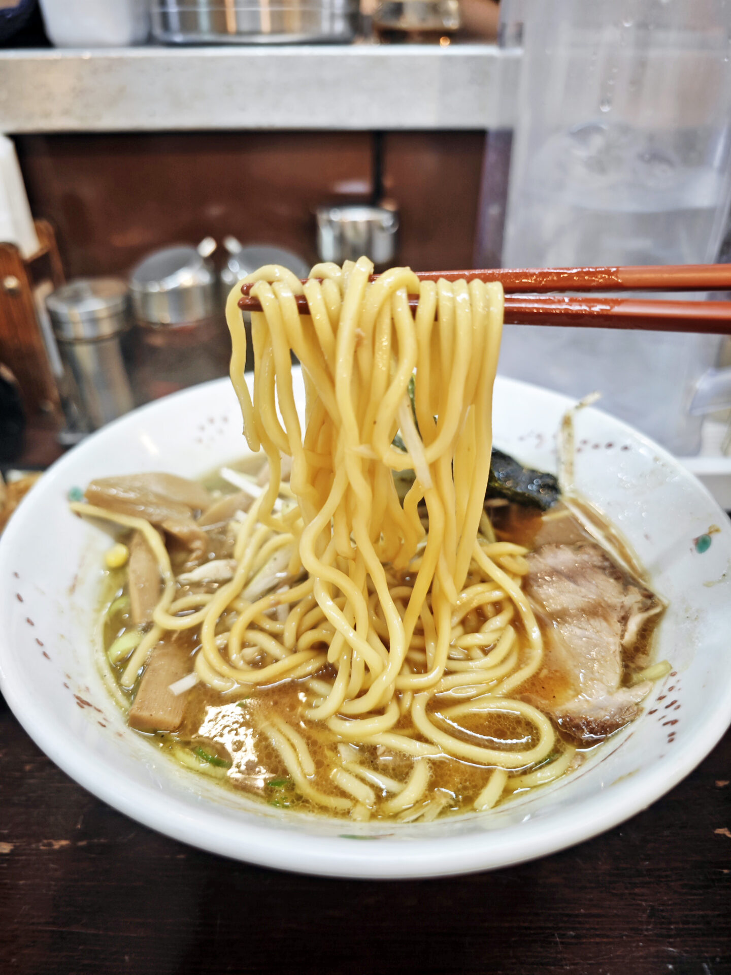 中太麺で、コシの強い硬めの歯ごたえが独特です。