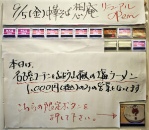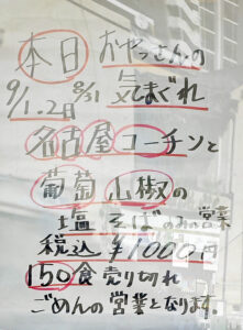 8月31日、9月1日、9月2日は、おやっさんのきまぐれ限定「名古屋コーチンと葡萄山椒の塩ラーメン」が、特別感謝価格1000円でのご提供となります。