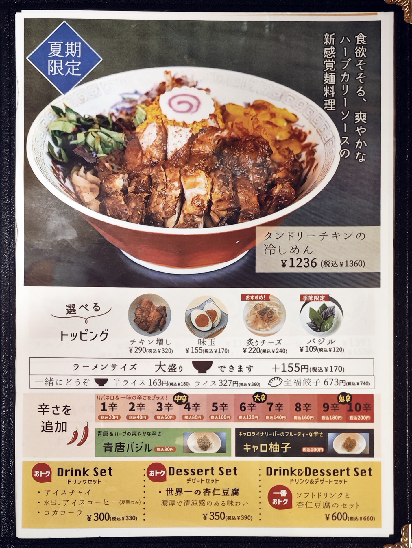 麺類は、「タンドリーチキンの冷し麺」、「貝出汁冷やしつけ麺」の2種類が提供されています。