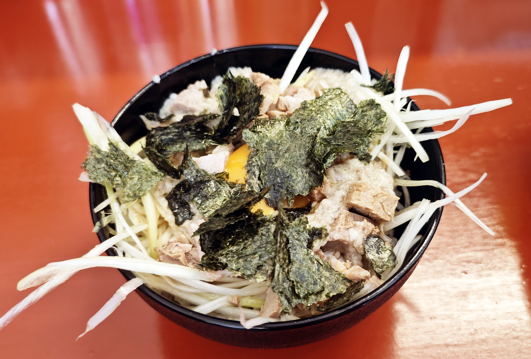 ご飯の上に、ネギ、チャーシューの細切れ、海苔、卵黄が乗っています。