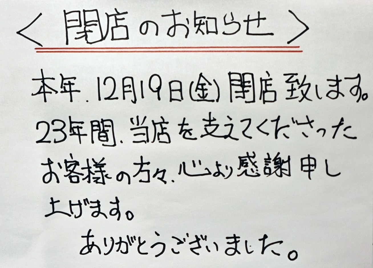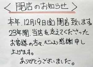 以前から店主の体調が悪そうでしたので、いつかは・・・と思っていましたが、とうとう来てしまいました。