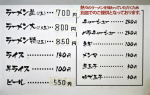 備考:みんみんラーメン出身。八王子市松木30-13-2-103より移転。煮玉子がある。ゆで玉子は殻付。