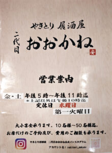 宿題だった「やきとり居酒屋 二代目おおかね」に行ってきました。