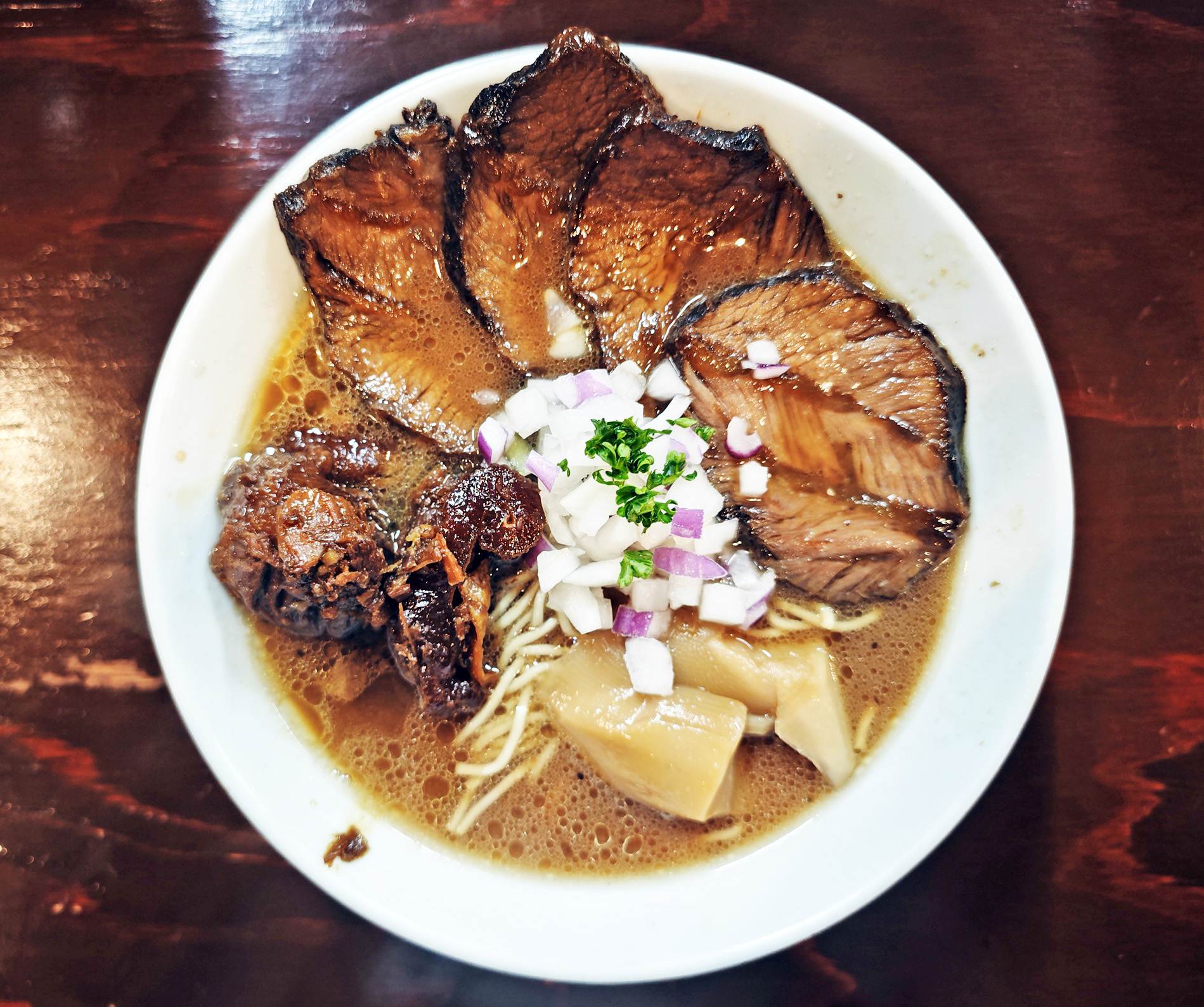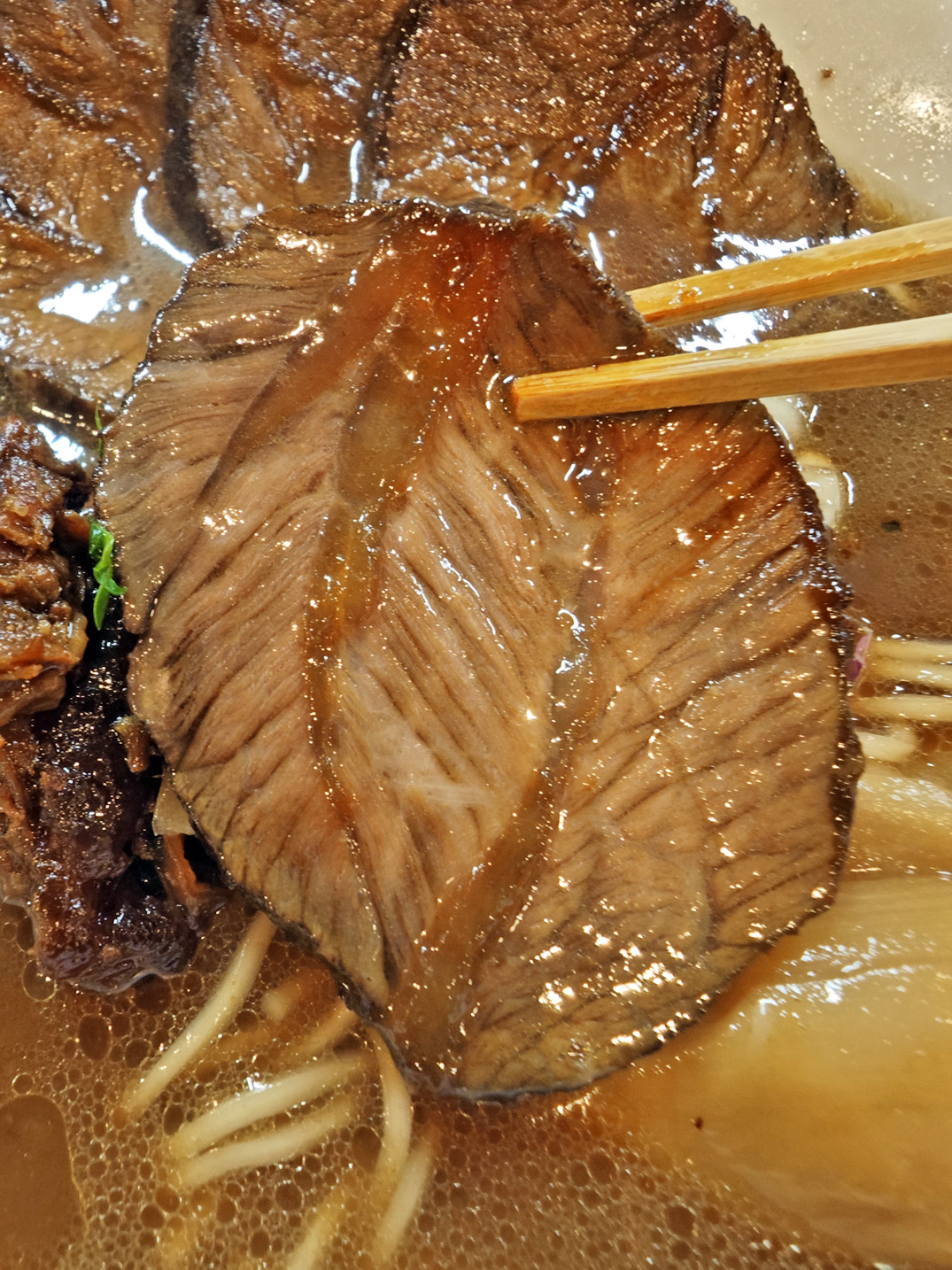 牛の骨やすじ肉、香味野菜などを長時間煮込んで作ったスープは、うま味の層が複雑に重なり、重厚感があります。