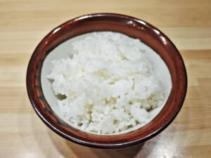 ラーメンを待つ間、サービスのライスをよそっておきます。