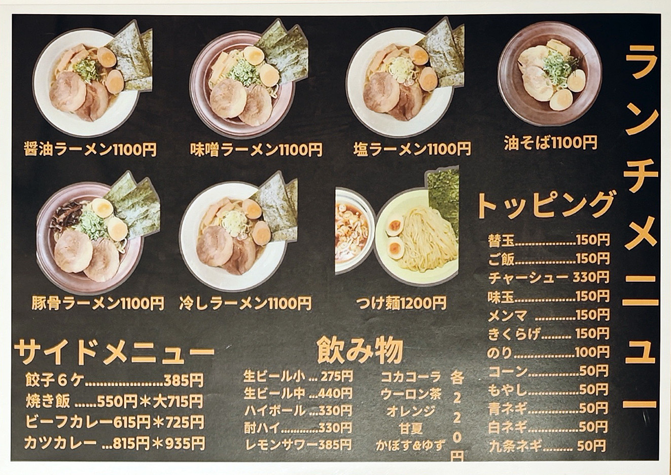 醤油、味噌、塩、豚骨、冷し、つけ麺、油そば、と取って付けたようにように、一通りのメニューが取り揃えられています。