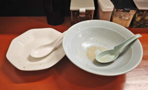 カウンター席に座ろうとしたら、その席は、スープが飛び散ったままでした。