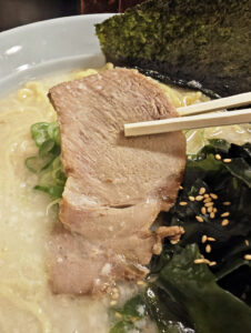 醤油で味付けされたチャーシューは、少しパサつきますが、タレの味が染みていて、まずまずの美味しさです。