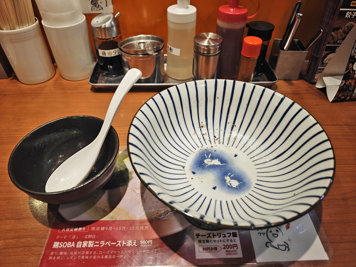 「しょうゆのおがわや 北野店」の限定は、「鶏SOBA 自家製ニラペースト添え」です。