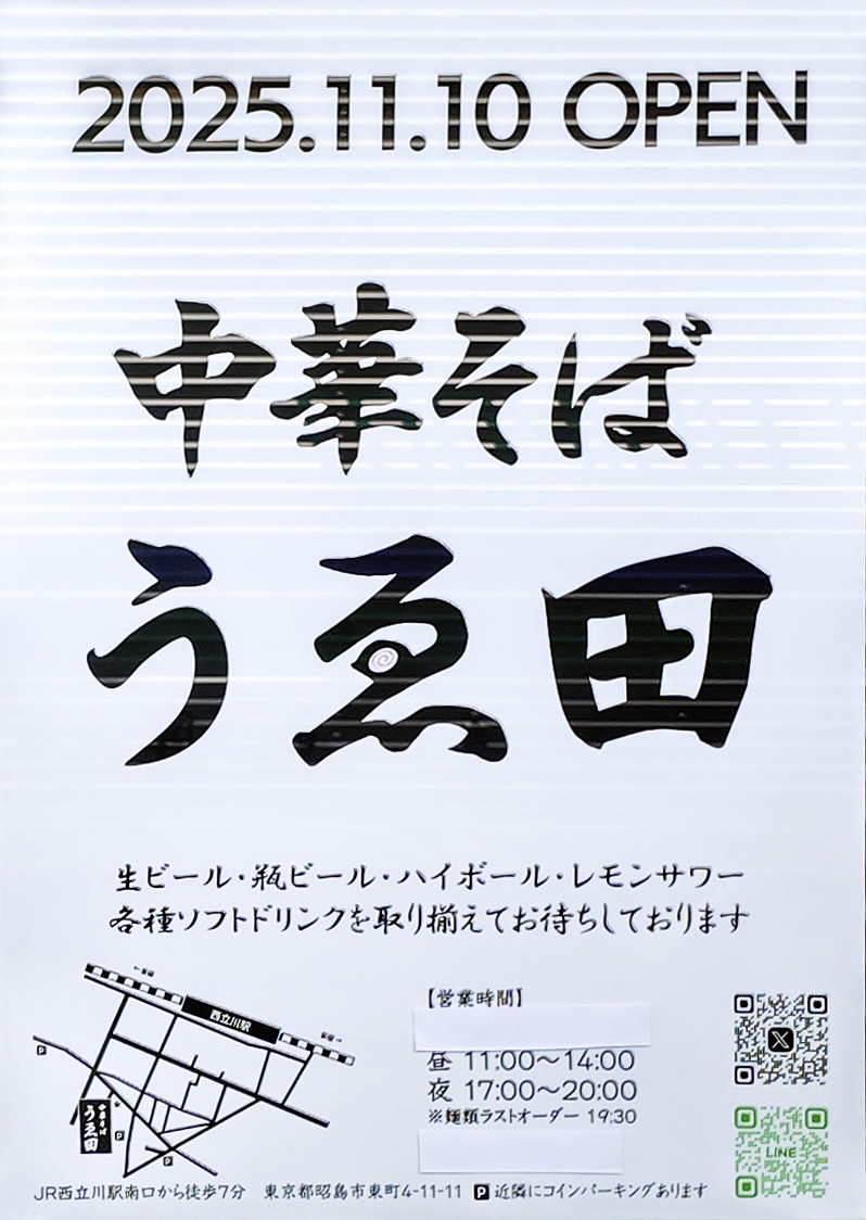 今日は2025年11月10日に、昭島市にオープンした「中華そば うゑ田」に行ってきました。