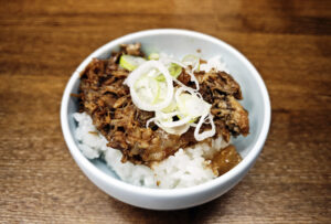 「豚バラナンコツ丼」は、ご飯の上に、ほぐした肉が敷き詰められており、ネギが添えられています。