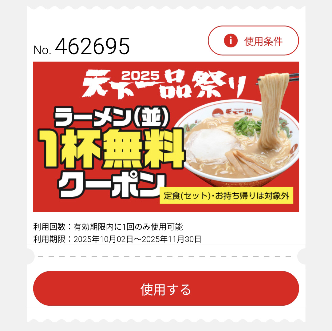 先日の天下一品祭りでゲットした”ラーメン一杯無料クーポン”の使用期限(11月30日)が迫っています!