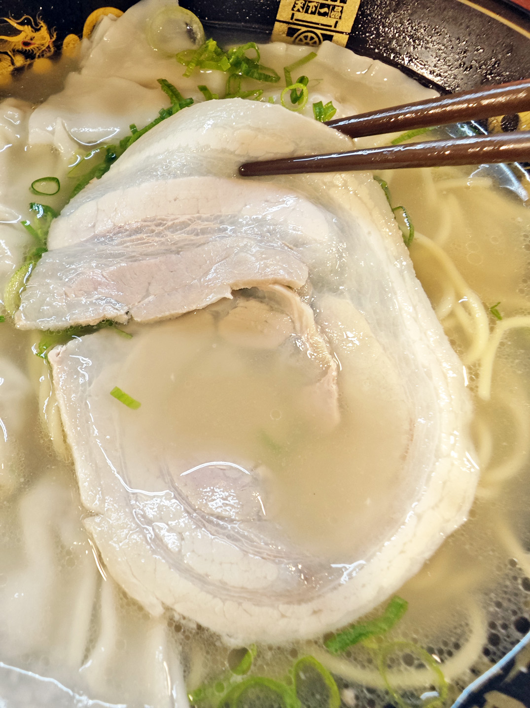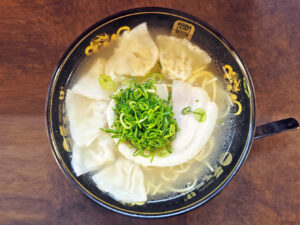 トッピングは、チャーシューとネギ、それにワンタンが6個乗ってきます。