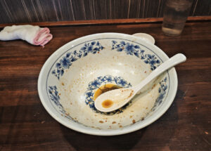 食べ進めるほどに具材の味が混ざり合い、途中からは麺、スープ、具の三位一体の旨味が加速していきます。