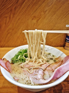 そこへ合わせられている全粒粉入りの平打ち麺は、ピロピロとした独特の啜り心地が魅力です。