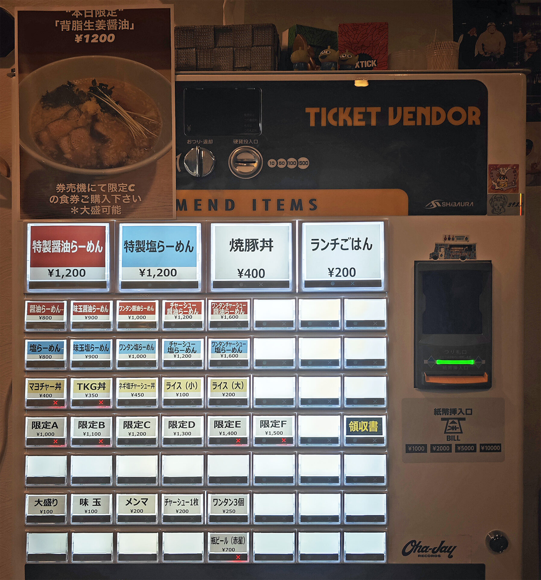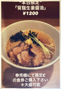 さて、本日は、限定告知のあった「背脂生姜醤油」とサイドメニューの「焼豚丼」を頂きます。