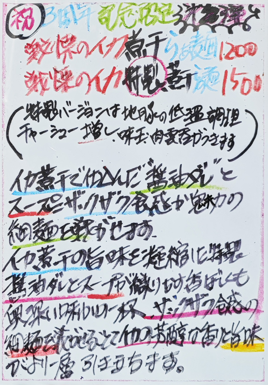 昨日のカルピスバターは仕事の兼ね合いで食べ損なってしまいましたが、2日目の「戦慄のイカ特製煮干らぁ麺」を頂きに参上しました。