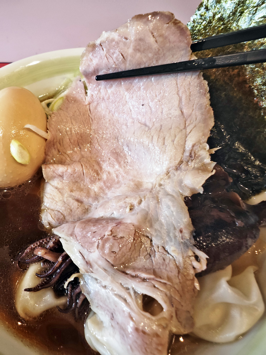 特製仕様には、地豚の低温調理チャーシュー増し、味玉、肉雲呑が添えられます。