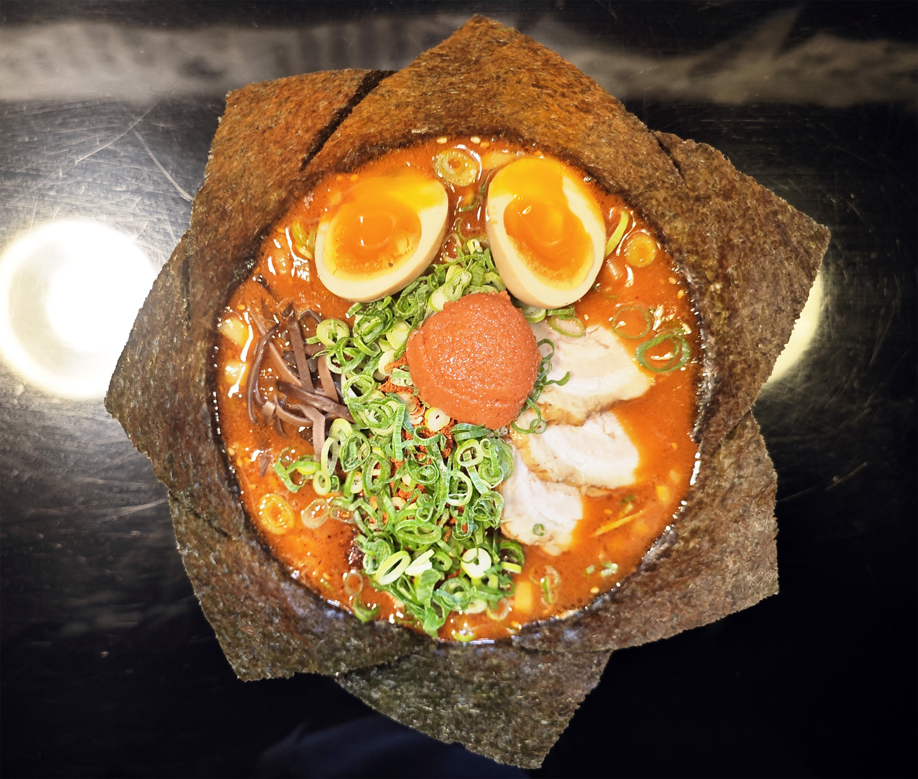 味玉が目に見えるし、明太子が鼻っぽく見えて、どことなく人顔に見えてきます。