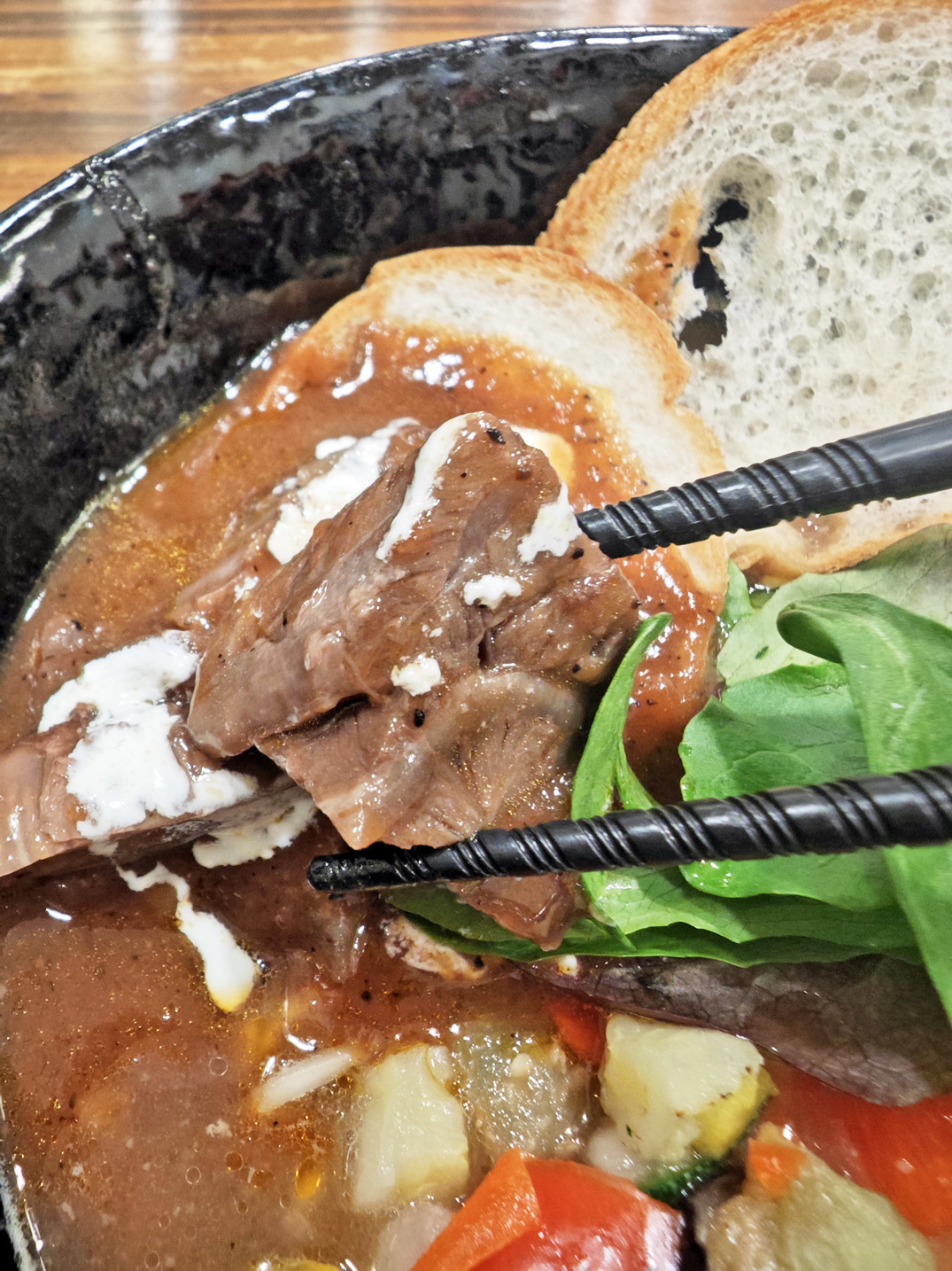 赤ワインでじっくりと煮込まれた牛肉は、箸を入れるだけでほどける柔らかさ。