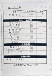 入口のところにメニューが貼ってあり、注文書に希望の商品を記入していく方式です。