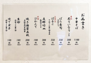 さて、今回は「中華そば」に、辛味の「ぴかんて」と”名物”とあった「炙りいなり2ヶ」を注文しました。