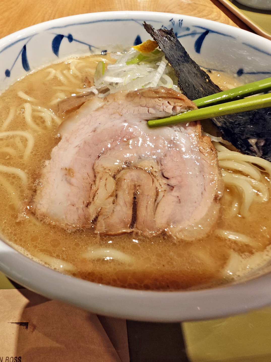 ラーメンには、具として、チャーシュー、メンマ、海苔、ネギ、柚子皮が乗っています。