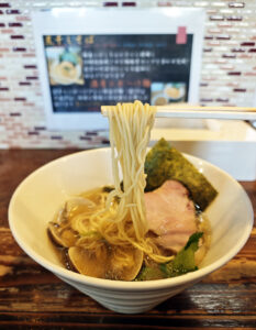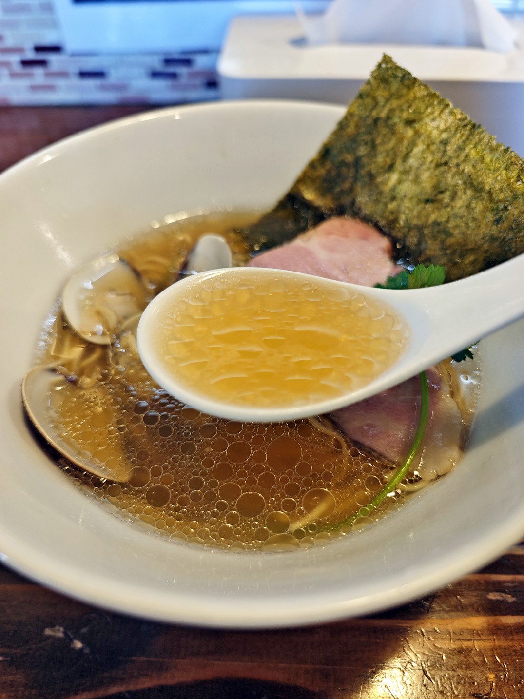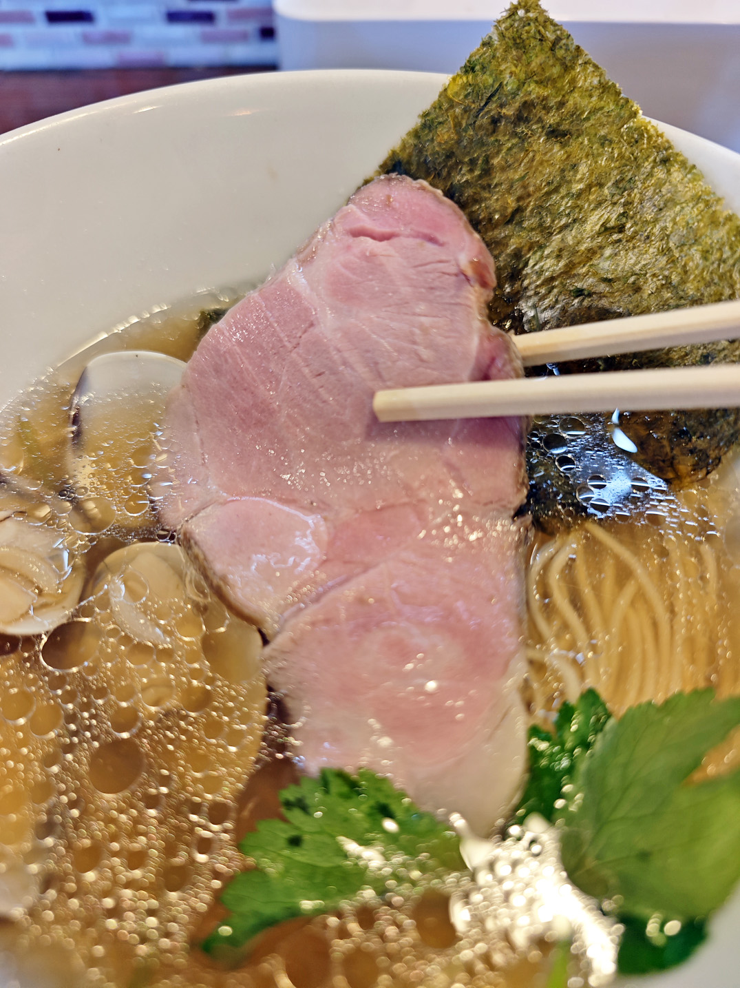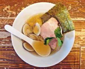 澄んだスープの表面に、チャーシューがしっとりと横たわり、その脇には蛤が二枚、控えめながらも確かな存在感を放っています。